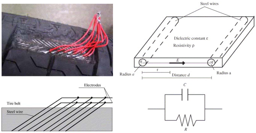 Without attaching sensors, Matsuzaki et al. [78-81] presented a self-sensing method using the tire structure itself as a parallel circuit of a capacitor and resistor as shown in Figure 4. Since the actual tire structure acts as a sensor, no additional sensor is required. Therefore, there is no debonding of the sensor, even during prolonged service, because there is no stiffness difference between the sensor and tire rubber. The measurement system could be small, lightweight and capable of withstanding harsh conditions. Moreover, the method allows for a more direct strain measurement than a method that uses a sensor attached to the inner surface does. Sergio et al. [30, 82] also developed a strain monitoring method that adopts the tire itself as a sensing element. The embedded grid of steel wires is used as the electrodes of a distributed array of passive impedances.