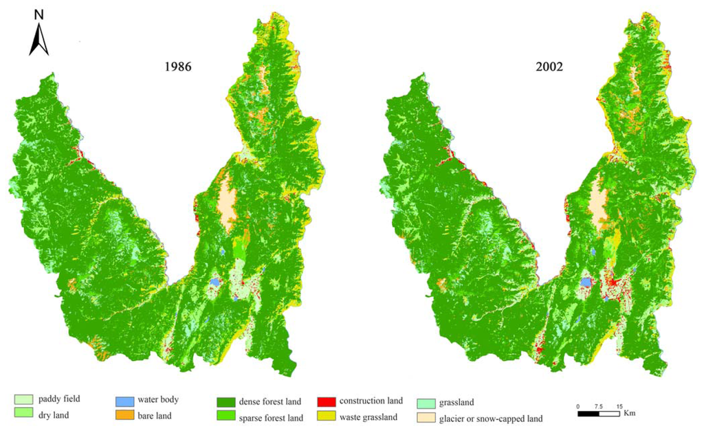 After land use maps of the study area in 1986 and 2002 were produced, the Kappa coefficient, one of the most popular measures [22], was used to make an accuracy assessment for land use classifications. Based on another reconnaissance field survey in July of 2002, the overall classification accuracy of the land use map for 1986 and 2002 was determined to be 83.2% and 86.7% respectively. And the Kappa coefficient for 1986 and 2002 maps was 0.77 and 0.82 respectively. The wrong identities of pixels were all corrected. The revised classification maps of land use in Lijiang County in1986 and 2002 were shown in Figure 3.
