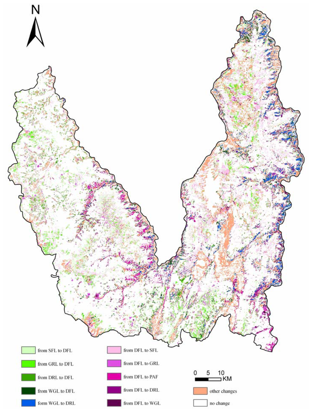 - Sparse forest land, bare land and grassland were more unstable with only 31.05%, 36.96% and 40.36% unchanged respectively, while their main conversion destinations were all dense forest land, which was partly due to the initiation of natural forest protection in the study area;