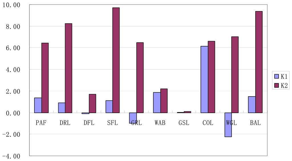 As shown in Figure 5, on one hand, as to the index of K1 measuring annual net increasing rates of land use types, construction land scored the highest, with a value of 6.14%, followed in order by waste grassland, water body, bare land, paddy field, sparse forest land, grassland and dry land, while dense forest land and glacier or snow-capped land accounted the lowest with a value of -0.1% and 0.04%, respectively. On the other hand, as to the index of K2 quantifying annual rates of conversion loss and gain of land use types, sparse forest land got the highest value of 9.72%, followed orderly by bare land, dry land, waste grassland, construction land, grassland, paddy field, water body and dense forest land, and glacier or snow-capped land was the lowest with a value of 0.11%.
