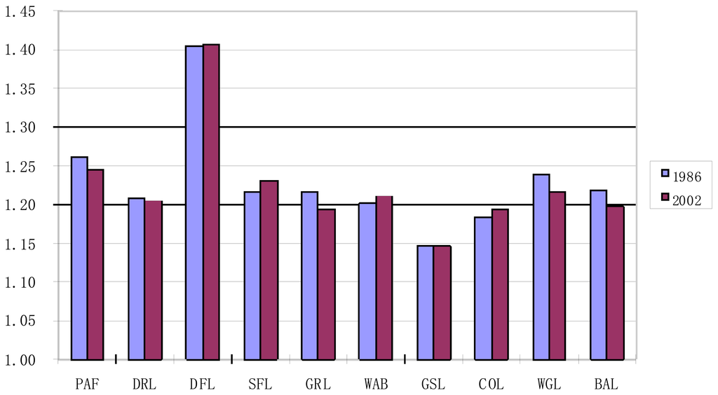Through Figure 6, it could be concluded that there was remarkable difference among FN at class level. From 1986 to 2002, the FN of construction land and sparse forest land were always the highest, with glacier or snow-capped land and dense forest land the lowest, which accorded with their difference in human disturbances. In details, the changes of FN of all the ten landscape elements in the study period were as follows: (1) along with the increase of area ratio, there was an increase of the FN of paddy field, sparse forest land, water body and bare land, which indicated that the conversion gain areas of these land use types mainly came from scattered small patches, and few bordered on former patches with the same land use type to form large patches; (2) the FN of grassland decreased with the shrinkage of area ratio, which meant that conversion loss of grassland was mainly in the form of small patches; (3) the FN of dense forest land and waste grassland increased in contrast with the decrease of their area ratio, which suggested that some aggregated large patches might be divided into scattered small patches in the process of conversion loss; and (4) the FN of construction land, dry land and glacier or snow-capped land decreased together with the increase of their area ratio, which showed that newly conversion gain from other land use types mainly resulted from the extending of former patches of corresponding land use types, and aggregated large patches came into being through the amalgamation of newly formed and former patches with the same land use type as a result.