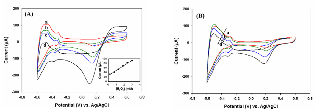 Cyclic voltammograms of a Pt electrode in the potential window of -0.6 ∼ 0.6 V with the scan rate of 0.2 V/s in 0.1 M phosphate buffer (pH 6.2). (A) The solutions were degassed before H2O2 was added. The concentration of H2O2 was 0, 0.748, 1.25, and 2.99 mM for lines (a) to (d), respectively, and the inset indicated the linear correlation of anodic peak current at 0.6 V with the concentration of H2O2. (B) The solutions were degassed before the oxygen-saturated sample was added, and the concentration of O2 was 0, 0.43, 0.86, and 1.3 mM for lines (a) to (d), respectively.