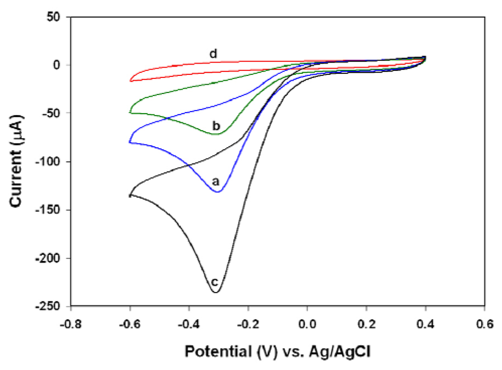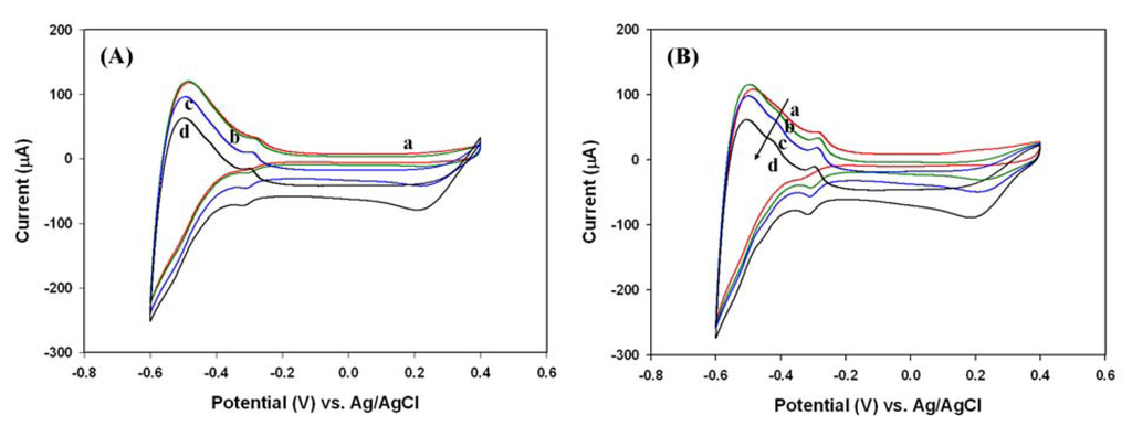 Cyclic voltammograms of a Pt electrode in the potential window of -0.6 ∼ 0.4 V with the scan rate of 0.2 V/s in 0.1 M phosphate buffer (pH 6.2). (A) The solutions were degassed before H2O2 was added. The concentration of H2O2 was 0, 0.748, 1.25, and 2.99 mM for lines (a) to (d), respectively. (B) The solutions were degassed before the oxygen-saturated sample was added, and the concentration of O2 was 0, 0.43, 0.86, and 1.3 mM for lines (a) to (d), respectively.