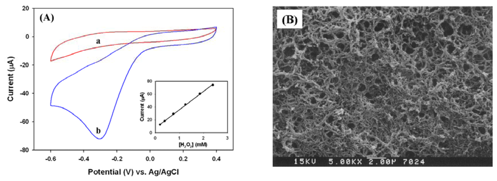 (A) Cyclic voltammograms of PANI/Pt electrode (a) in the absence of H2O2 (red) and (b) in the presence of 2.39 mM of H2O2 (blue). Inset indicated the linear correlation of cathodic peak current at -0.32 V with the concentration of H2O2. (B) The SEM image of PANI film on the Pt electrode.