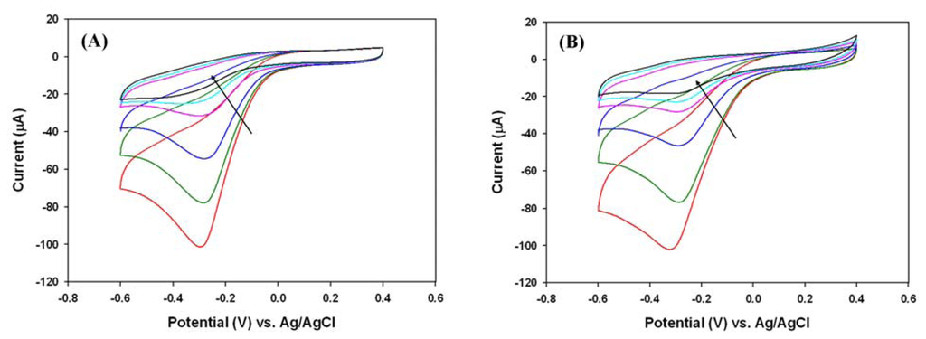 Meanwhile, a major cathodic peak between 0.1 ∼ 0.2 V was observed, whereas the potential shift slightly towards negative with the increase of H2O2 concentration. Applied the same electrode to an oxygen-saturated solution with the same potential window, the cathodic peak near 0.2 V was also visible with similar peak shift, but not the reduction of H2O2 near 0.6 V (Figure 1B). Therefore, the cathodic response to H2O2 in Figure 1A was possibly associated with the further reduction of oxygen on the Pt electrode, in which one-step four electron pathway was proposed as reaction (2) [35]:
