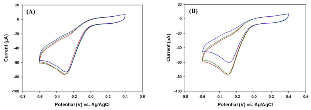 The effects of oxygen scavengers (A) sodium thiosulfate and (B) ascorbic acid on the detection of 2.39 mM H2O2 in 0.1 M phosphate buffer (pH 6.2). In both Figures, the concentrations of oxygen scavenger were 0 mM (red), 1 mM (green), and 5 mM (blue), respectively.