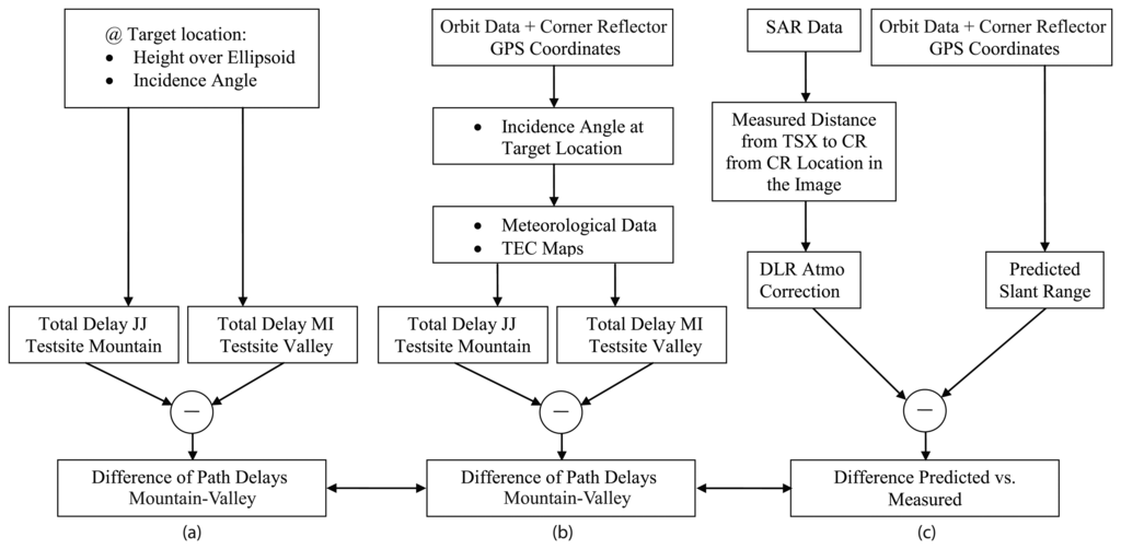Estimation of atmospheric path delay directly from the SAR data was performed using precise DGPS measurements of four observed targets (corner reflectors) in the images. The range distance between the DGPS coordinates and the sensor is considered to be the reference for all estimates. The atmospheric corrections proposed in the TSX annotations, based on an average reference height (AVG), are applied to the image data (correction of fast time parameters). Their differences compared to the GPS measurements provide relative deviations from the reference range distance. The relative differences in path delay estimates between the corner reflectors located at different altitudes are calculated in a final step. These calculations point out varying propagation properties and indicate possibilities for refinement (Figure 2c). Ionospheric contributions are also considered, although they play a minor role at X-band frequencies, especially at the current solar minimum. Average estimates for their contribution (path delay at 5 TECU) are provided in the TSX product annotations [20]. Measured values were estimated using total electron content (TEC) maps describing spatial variations in TEC values across the Earth. The one-way ionospheric path delay may be estimated from [21]: