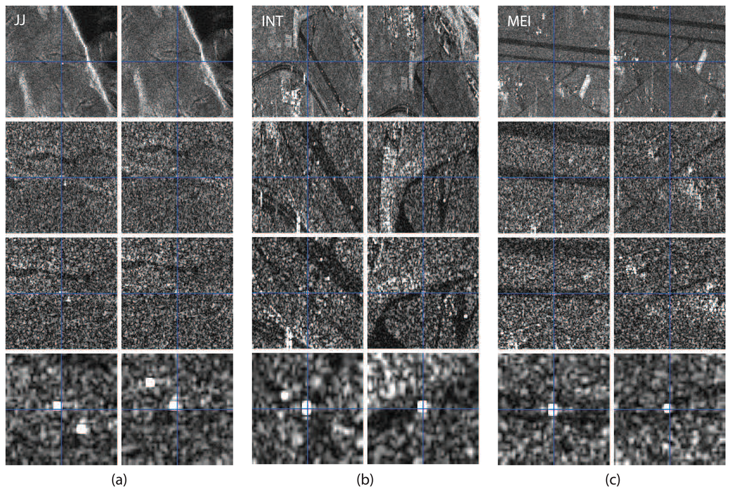As a first test, the absolute image localization error for all four corner reflectors in each of the six TSX products was measured. Accurately surveyed DGPS measurements of the corner reflectors were used to predict their range and azimuth positions in each image, and these predictions were compared to their measured locations. Figure 3 shows an example for the absolute location error estimate for (a) Jungfraujoch (JJ), (b) Interlaken (INT) and (c) Meiringen (MEI). At successive 'zoom' levels, the blue crosses indicate the prediction based on the GPS measurements, which represent the runtime measurements under ideal vacuum conditions. These image position predictions were made by solving the Doppler and range equations [22] using the surveyed target coordinates, together with the precise orbit state vectors and the image timing annotations [20]. The precise corner reflector (phase center) position in the image was determined by searching for local maxima in the neighborhood of the strong targets, using complex-FFT oversampling (factor of 50) to obtain sub-sample accuracy [22]. Results of the following analysis are based on the location error of the two corner reflectors at each test site, both at the same altitude and equidistant to the sensor. Figure 4 shows a scatter plot of all estimated location errors. The blue circles indicate descending-, the red circles ascending products. While for Interlaken and Meiringen (b) the range errors are on the order of a cm, for the Jungfraujoch site (a) the range errors increase to a mean of approximately 0.58 m. Since the TSX tropospheric correction is based on an average scene height roughly halfway between the test site altitudes (Jungfraujoch and Meiringen/Interlaken), the expected average location errors in range for the sites would be expected be approximately of the same magnitude with opposite signs.