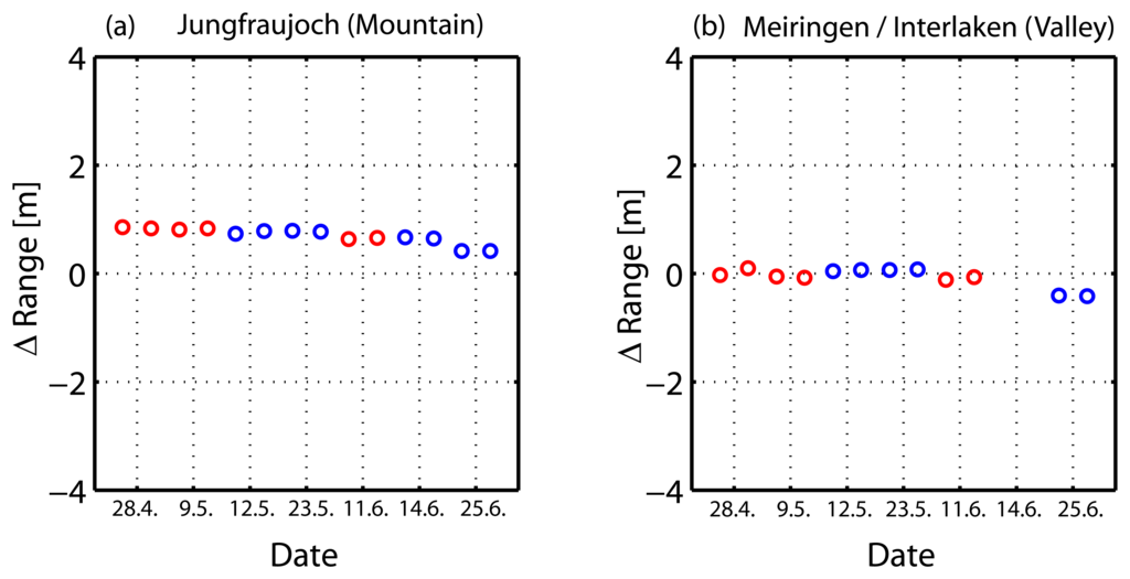Another interesting side effect is that the average scene height in both configurations is close to the midpoint between the two reflector altitudes. Additional meteorological data (temperature, water vapour pressure, air pressure) from weather stations near Meiringen, Interlaken and Jungfraujoch provided further reference information for accurate modeling of the refractive index and atmospheric path delays.