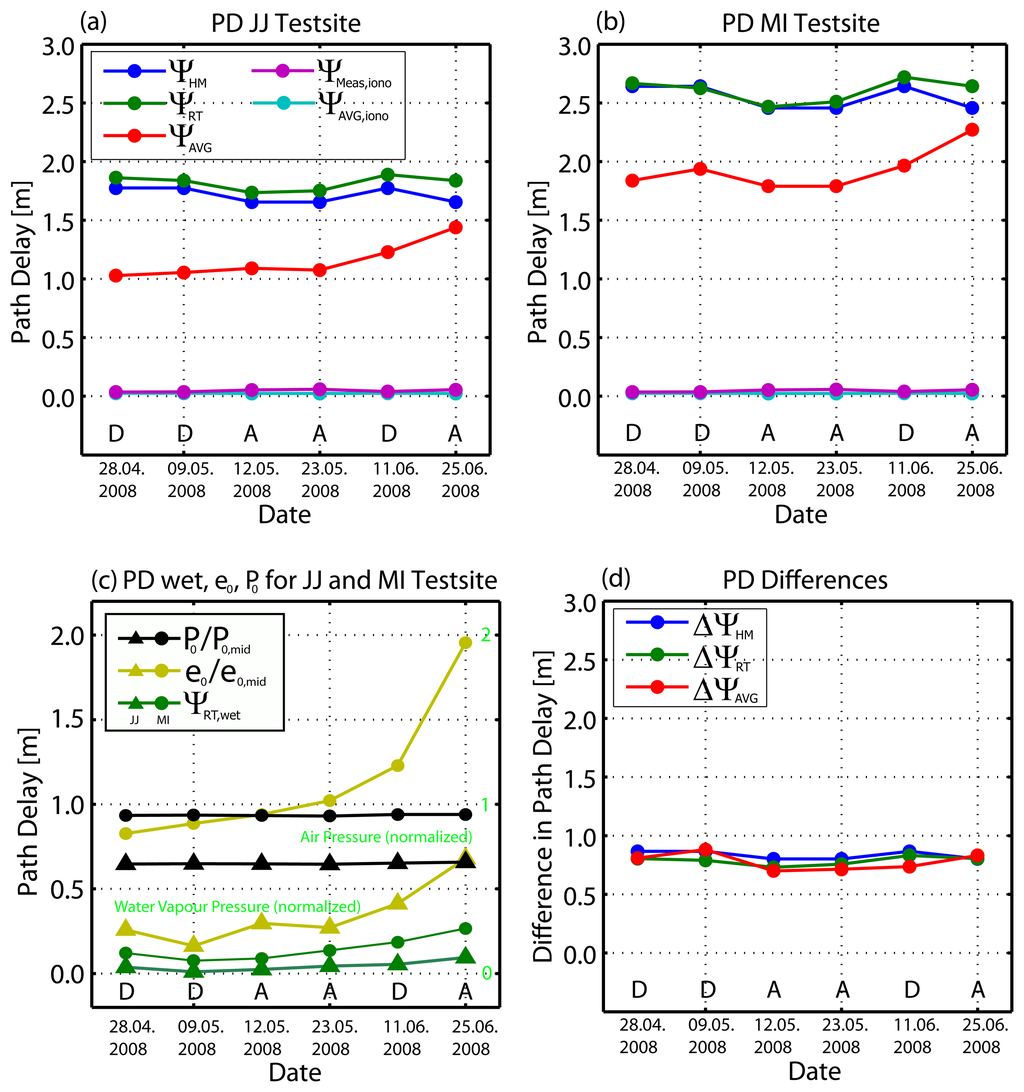 Modelled and measured atmospheric path delays. Path delays in a) for JJ testsite and in b) for the MI testsites. In c) wet path delays compared to measured air- and water vapour pressure (normalized) and in d) path delay differences between the results of the JJ and the MI testsites.