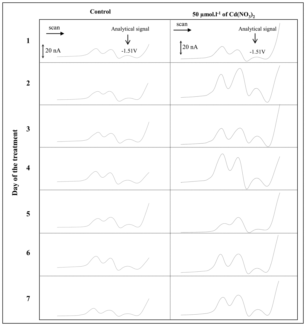 Differential pulse voltammograms of the control earthworms and earthworms exposed to cadmium(II) ions of 50 μmol.l−1 during the seven days long experiment.