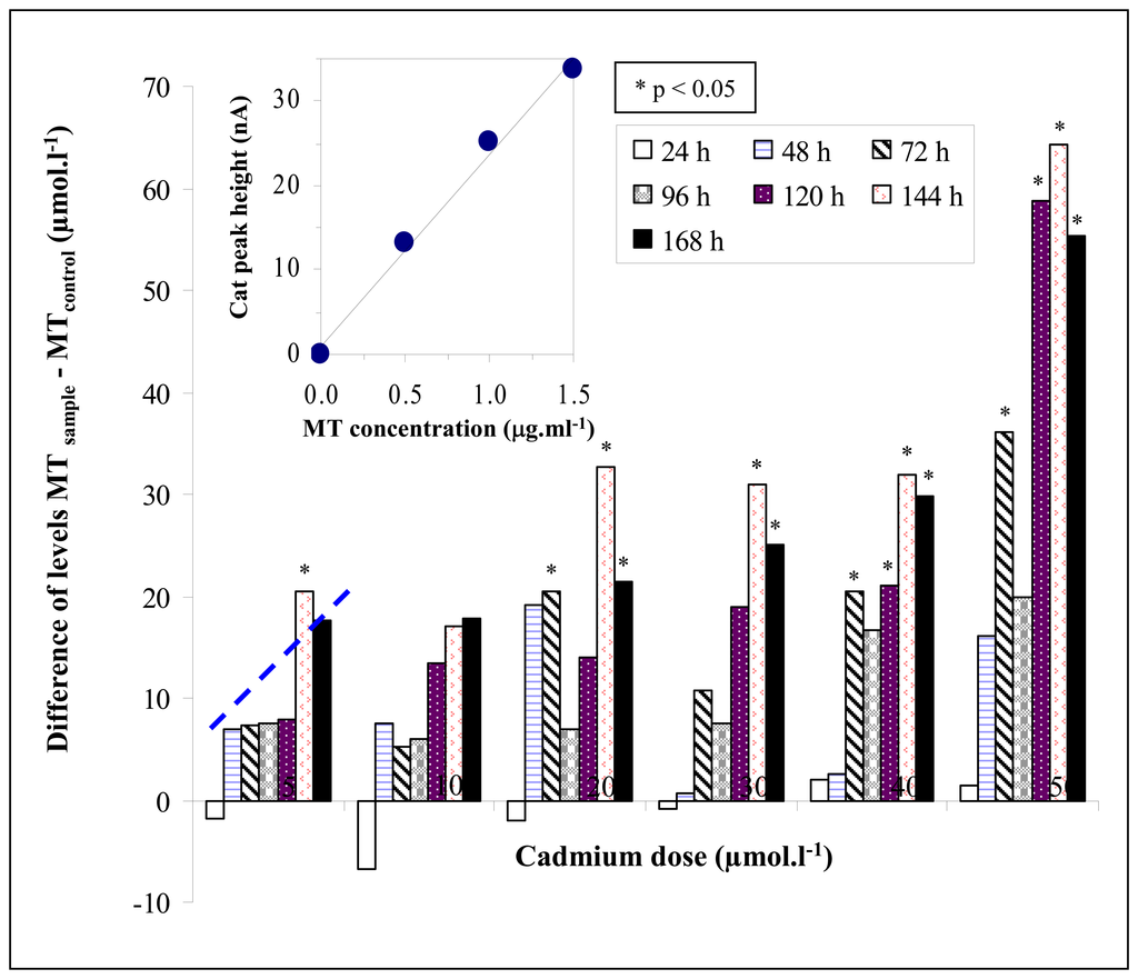 The differences of MT contents (MT sample − MTcontrol) in earthworms kept in different cadmium concentration (0, 5, 10, 20, 30, 40 and 50 μmol.l−1) for seven days. In inset: dependence of peak height on MT concentration added to the brewery sludge.