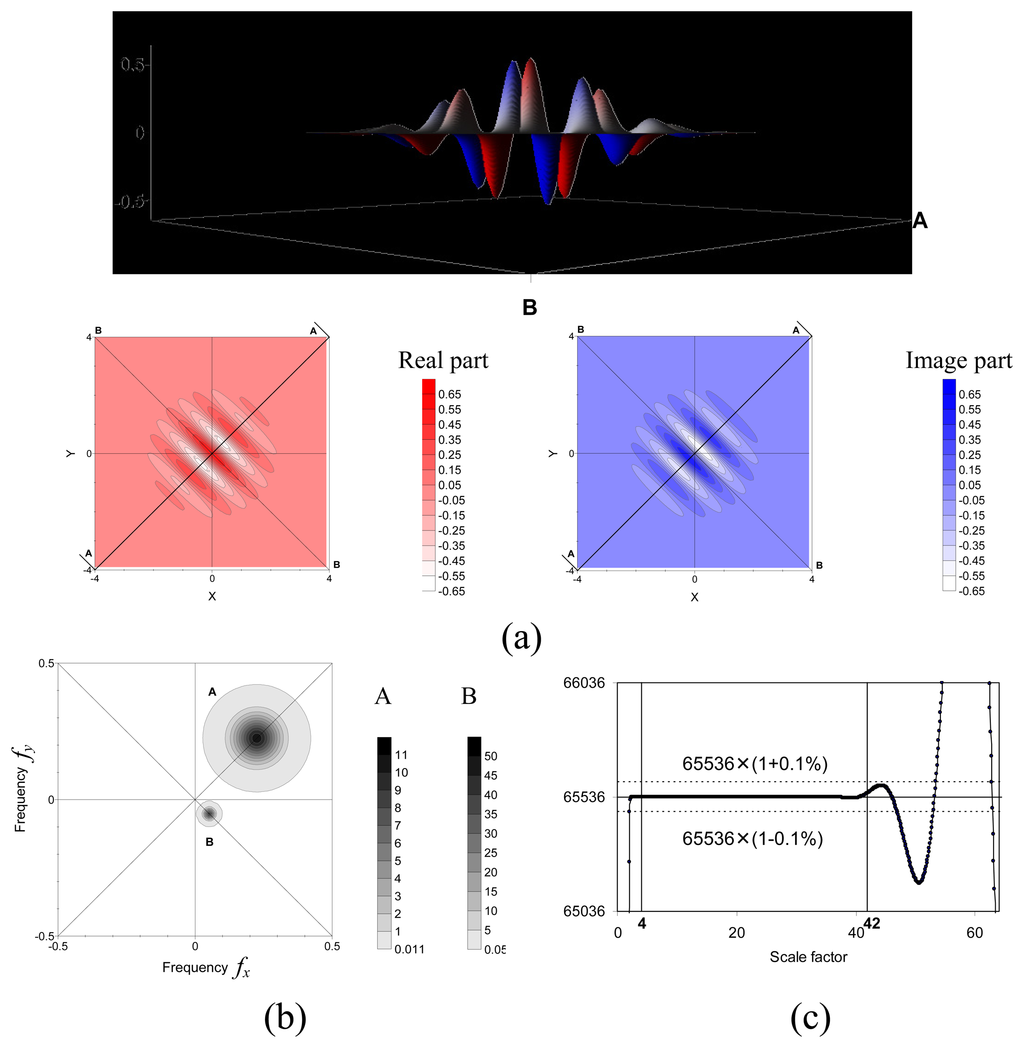 Characteristics of the directional 2D Morlet wavelet function. (a) Vertical and lateral views of real and image parts of the Morlet wavelet function, while the directional angle is π/4 and the scale factor is one. (b) Fourier transforms of the conjugate of wavelet function with different scale factors and directional angles, where A's scale factor is three and directional angle is π/4 while B's scale factor is 18 and directional angle is −π/4. (c) For a scale factor between four and 42, determination of Equation (7) is 65536 × (1 ± 0.1%)for a study area composed of 256 × 256 (65536) grid nodes.