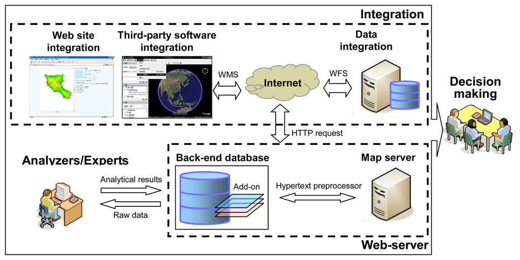A back-end database is utilized for storing and handling geospatial data (e.g., PostgreSQL and GRASS), while an accompanied add-on deals with geospatial data using spatial operations (e.g., PostGIS). Experts or analysts can easily retrieve raw geospatial data from a database to detect landsides and update the database with analytical results. A hypertext preprocessor (e.g., PHP) connects a web server (e.g., Apache) and back-end database, whereas a map server (e.g., Mapserver) conjugating the web server serves as a common gateway interface (CGI) for geospatial data requests from clients. The CGI implements protocols, termed web map service (WMS) and web feature service (WFS), developed by the OGC that allows end users to retrieve geospatial data via a hypertext transmission protocol (HTTP) request. The WMS allows clients to overlay map images retrieved from multiple sources for display on the Internet [15], whereas the WFS allows clients to retrieve and update geospatial data encoded in GML [16]. Via this architecture, clients can utilize map images and attributes of spatial features maps gathered from different sources (Figure 2).