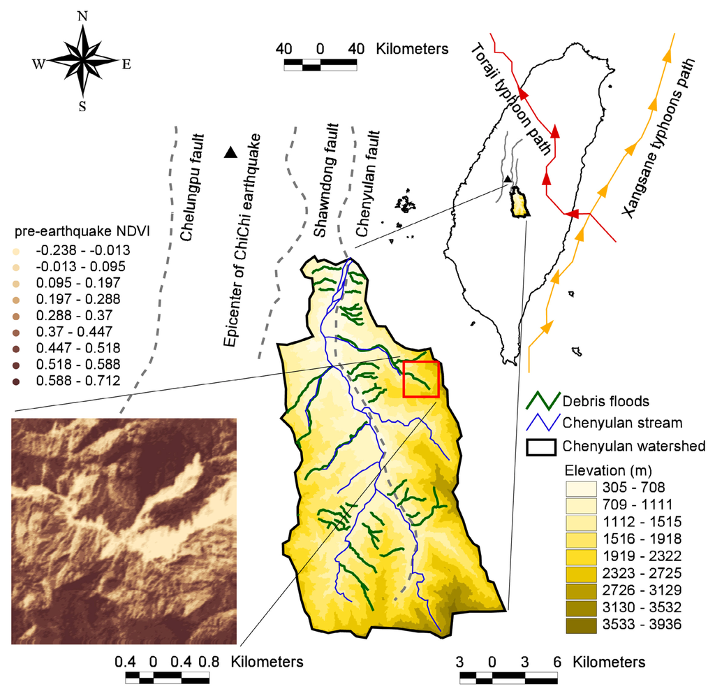 Earthquakes have long been recognized as a major cause of landslides [1]. However, landslides are only the first in a series of processes by which materials can be removed from slopes and transported out of a region by fluvial action [2]. In Taiwan, typhoons that unleash massive amounts of rainfall hit Taiwan every year between July and October. Since 1999, after the ChiChi earthquake, the expansion rate of landslide areas has grown 20 times in central Taiwan [3] due to the numerous extension cracks, which accelerate landslides during downpours, generated on hill slopes during the ChiChi earthquake [4]. Landslide monitoring, management, and land-cover restoration have become high priority tasks that reduce damage to livelihoods and economies. However, landslides monitoring via field surveys is time consuming because of the widespread distribution of landslides and limited accessibility to disaster regions. Remotely sensed data has become an efficient means of quantifying the spatial characteristics of landscape changes both regionally and globally [5].