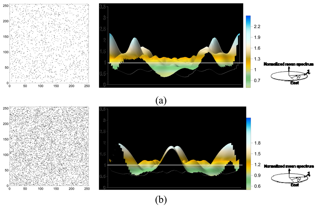 Two spatially random point patterns with point densities of 0.025 (1639/65536) and 0.1 (6554/65536) were generated (Figure 4). The spectrum map of those two patterns were normalized using the square mean of original data,