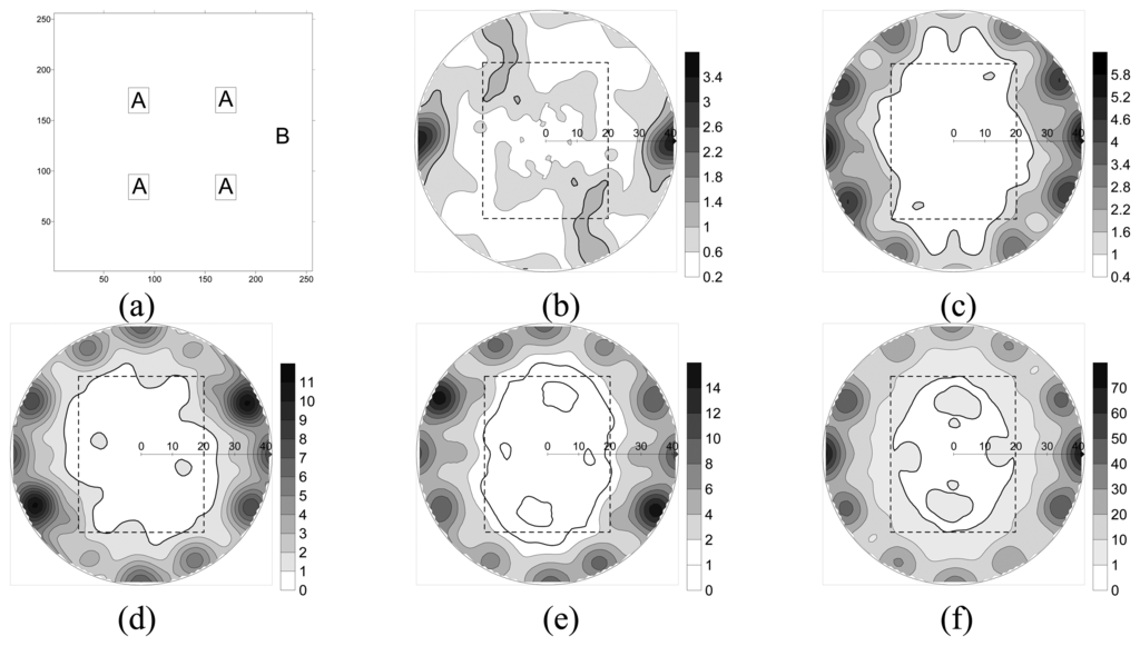 (a) Point clumps with different densities were generated in 4 ′A′ regions each with area of 20 × 25 on a random background ′B′ with area of 256 × 256. The background randomness has a point density of 0.025 (1639/65536). Spectrum maps of clumps with (b) 2-fold, (c) 4-fold, (d) 6-fold, (e) 8-fold, and (f) 24-fold point densities relative to the background were used to verify the performance of directional 2D Morlet wavelet analysis in separating true patterns from random fluctuations. The dashed polygons represent shapes and scales of point clumps. For a recognizable pattern, the thick solid line, that represents a normalized mean spectrum of one, is expected to be totally contained in the dashed polygon.