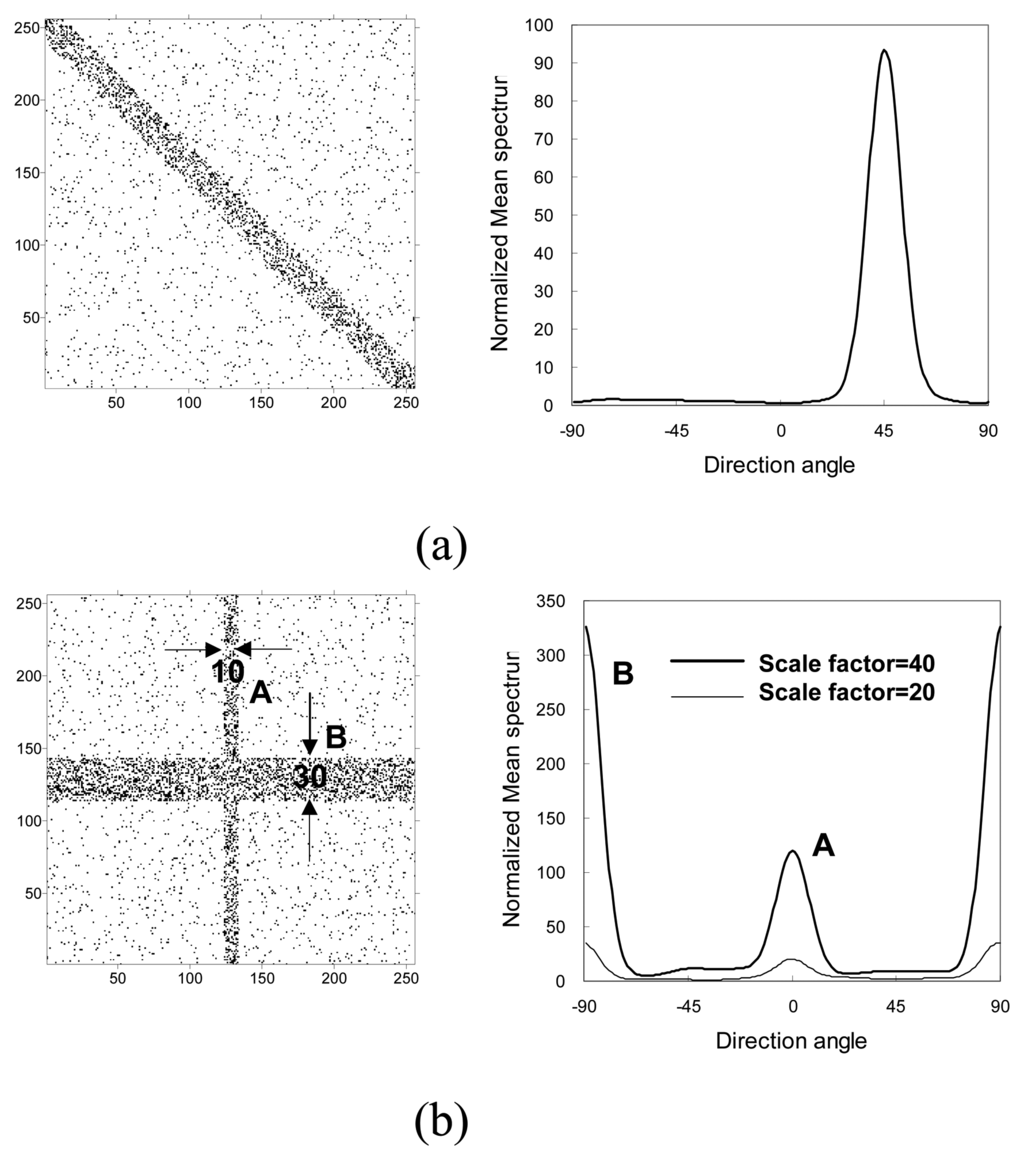 A belt pattern with a declination of −π/4, width of 20 grid nodes and a crucifix pattern composed of two belts with widths of 30 and 10 grid nodes and respective declinations of zero and π/2 were generated. The normalized mean spectrums on a specific scale were diagramed against directional angles. Figure 6(a) presents the mean spectrum on a scale factor of 30, the largest normalized mean spectrum identified in the direction perpendicular to the declination angle, π/4, along which the maximum variation in the point pattern occurred. For the crucifix pattern, the normalized mean spectrum on a scale factor of 40 is the largest at a directional angle of π/2 for the thick belt with a width of 30 grid nodes and declination of zero. The largest normalized mean spectrum for the thin belt is at a directional angle of zero, and this value is markedly smaller than that of the thick belt. However, as the scale factor for wavelet analysis decreases from 40 to 20, smaller than the width of the thick belt and larger than the width of the thin belt, the largest normalized mean spectrums between thick and thin belts are the same (Figure 6(b)). Analytical results indicate that the pattern of point clumps is distinguishable only when the scale of the filtering bank in wavelet analysis is larger than clump sizes. These simulations demonstrate that directional 2D Morlet wavelet analysis is efficient in detecting dominant scales and angles in a spatial pattern.