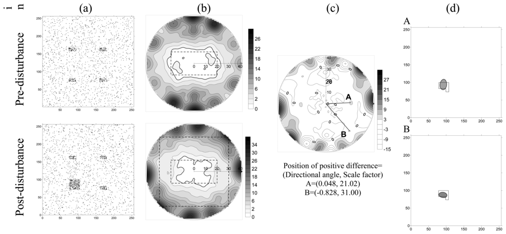 Significant differences at a pre-defined location in (a) two patterns denominated as pre- and post-disturbances were assessed by their (b) normalized mean spectrums, where dashed polygons represent shapes and scales of point clumps. (c) Increments of normalized mean spectrums for post-disturbances relative to pre-disturbance patterns were identified by scale factors and directional angles. (d) Localized spectrums determined by setting the filtering bank according to identified scale factors and directional angles were calculated for every node of the post-disturbance pattern. Location of high spectrums (shaded area) in the post-disturbance pattern coincided with the pre-defined location (empty polygon).