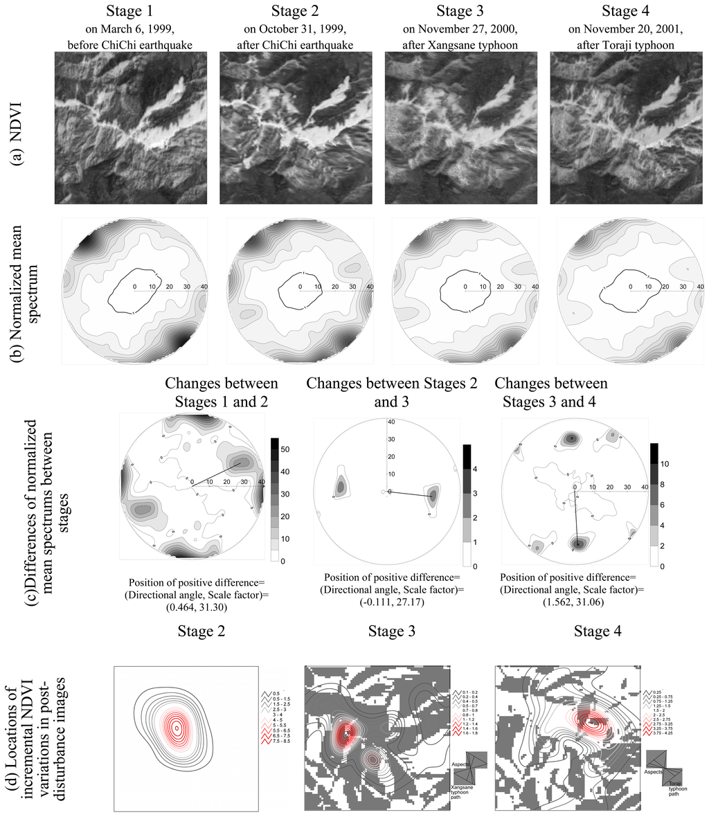between Stages 1 and 2, typhoon Xangsane between Stages 2 and 3, and typhoon Toraji between Stages 3 and 4, the NDVI variations are considered mainly caused by these large natural disturbances. The dominant scale factor and directional angle of landslide patterns induced by natural disturbances were identified by the most significant differences in NDVI variations between stages (Figure 8(c)). The dominant scales and directional angles were 31.3 and 0.46, 27.2 and −0.11, and 31.1 and 1.52 for the ChiChi earthquake, typhoon Xangsane, and typhoon Toraji, respectively. The dominant scale of NDVI variations induced by typhoon Toraji is larger than that induced by typhoon Xangsane, probably due to the fact that typhoon Toraji brought relatively more amount and stronger intensity of rainfall. The filtering banks in wavelet analysis were set according to the identified dominant scales and directional angles to determine localized variations surrounding each grid in post-disturbance images (Figure 8(d)). The spatial distribution of incremental NDVI variations at Stage 3 relative to Stage 2 and at Stage 4 relative to Stage 3 combined with hill aspects were used to identify the orographic effects due to interactions between typhoons and mountain topography. High NDVI variations existed on hillsides with hill aspects within ±π/4 aligned with typhoon paths.