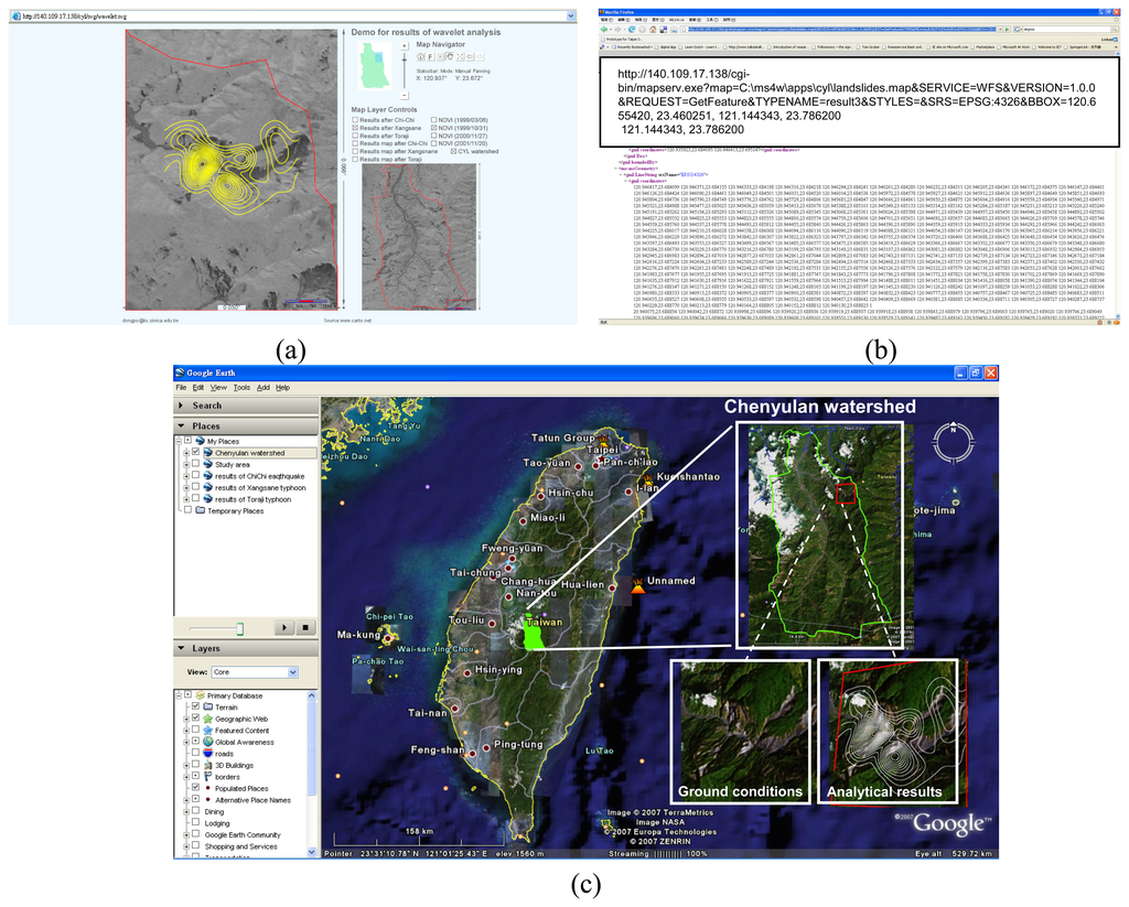 Figure 9(a) presents a snapshot of the interface implemented by GML-compliant language (e.g., scalable vector graphics or SVG) allowing clients to browse analytical results on the Internet using a web browser. Figure 9(b) shows the WFS request for analytical results. The GML document is a document that can be opened by any generic web browser via an HTTP request. Thus, data can be distributed worldwide instantly. In addition to using a web browser, end users can use the WMS/WFS complaint applications, such as Google Earth, to request maps via the Internet (Figure 9(b)). Many commercialized GIS applications have also been implemented to handle GML documents (e.g., Tatuk GIS). The prototype in this study is a way of overcoming difficulties by rapidly integrating heterogeneous data and efficiently transporting disaster information via open geospatial technologies.
