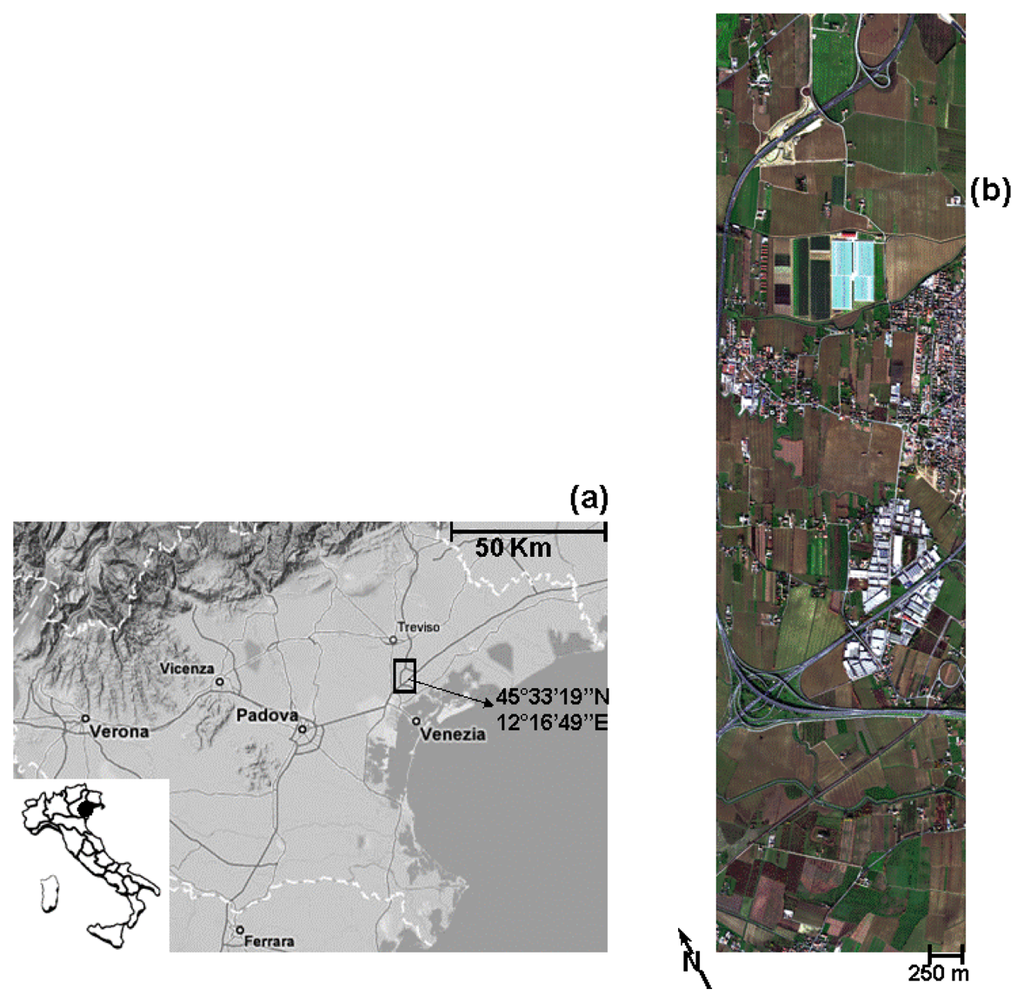 The study area (Figure 1) is characterized by a mixture of urban land cover types and surface materials, including many asphalted roads and, in particular, two main highways with asphalt pavements of different ages and conditions (i.e., more or less weathered and corroded). The study area corresponds to a MIVIS (Table 1) scene of 755 columns × 2956 lines (Figure 1b) and is centered at latitude 45°33′19″N and longitude 12°16′49″E. The flight strip was acquired over a rural area close to Venice city (Italy; Figure 1a) on November 23, 2006 at 11:56 (GMT), using scan rates of 25 scans/s at an altitude of 1500m, corresponding to a 3-m ground-pixel resolution at the instrument's IFOV.