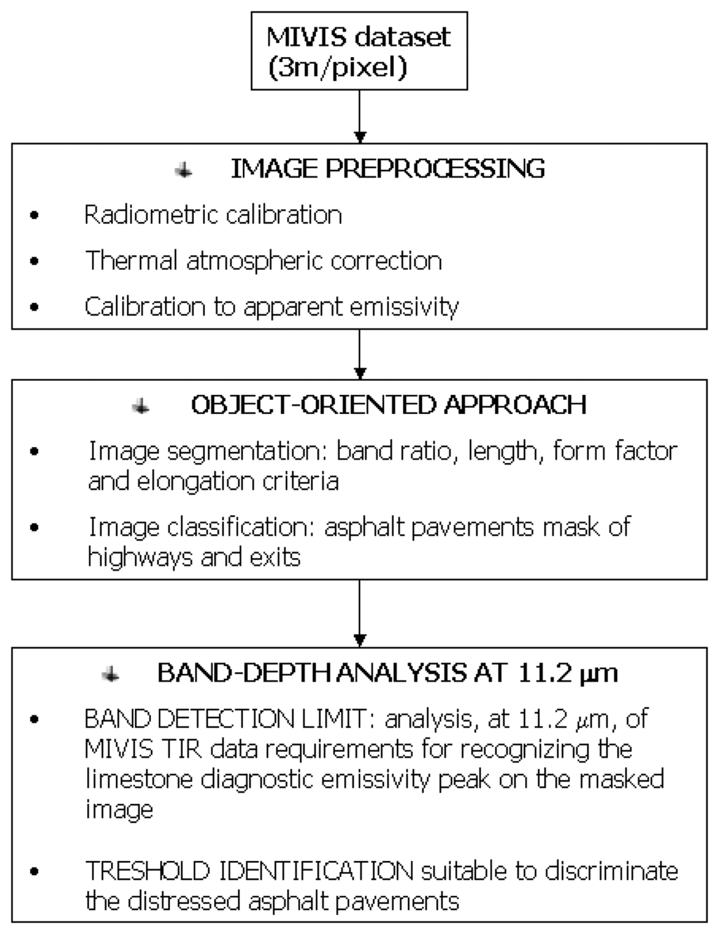 To develop a method for automated image analysis of road asphalt pavements on the basis of their emissivity spectral features, (a) an object-oriented approach and (b) a band-depth analysis were used (Figure 2).
