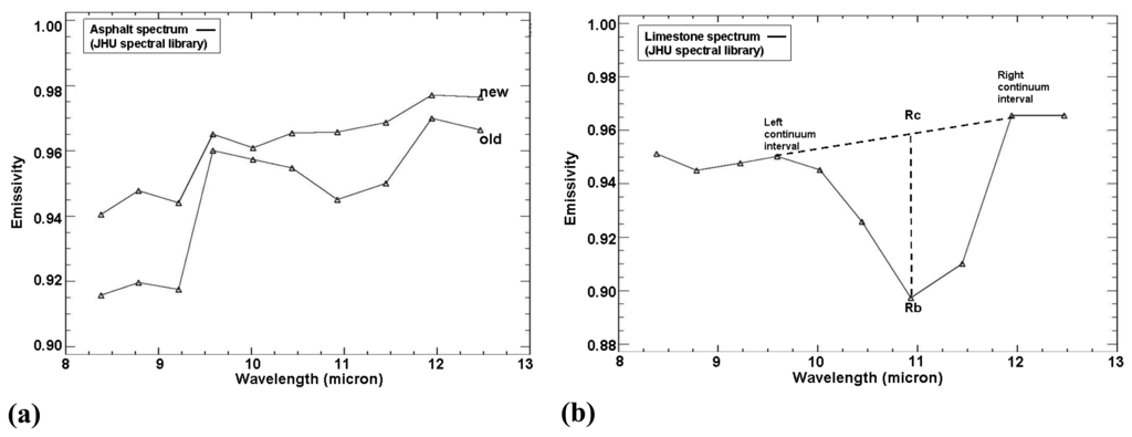 Examples (a) of new and old emissivity spectra of paving asphalt from the JHU spectral library and (b) of limestone band-depth analysis (intervals 9.59-11.94μm): emissivity continuum-removed absorption peak of a pure limestone spectrum (JHU spectral library), both convolved to MIVIS bandpasses in order to show how its occurrence would affect MIVIS detectability.