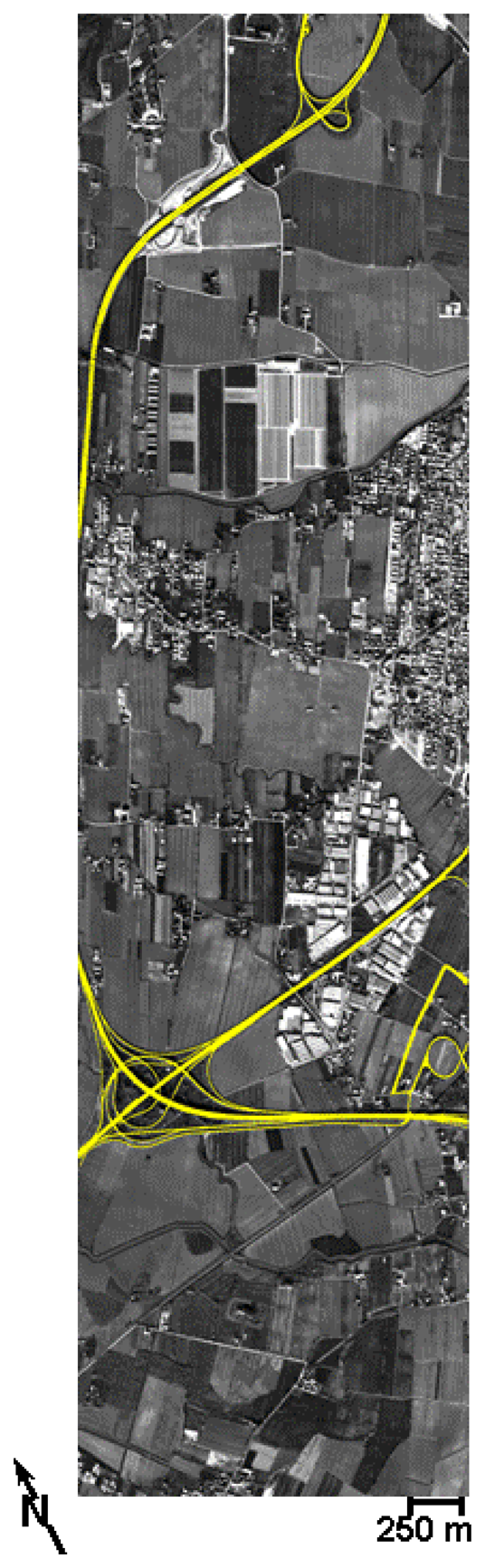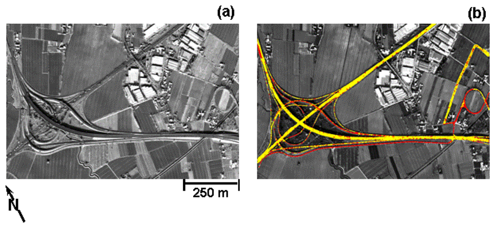 In this application, the highways/exits asphalt roads feature classification, shown in Figure 5, was obtained by assigning to the band ratio criterion (concerning the MIVIS emissivity channels centered at 10.93 and 11.94μm) a weight of 0.5, whereas the spatial criterion received the remaining weight of 0.5 (length 0.4, form factor 0.2 and elongation 0.4). These optimal segmentation parameters were determined using a systematic trial and error approach validated by the visual inspection of the quality of the output image objects, i.e., how well the asphalt pavements matched feature boundaries in the image [46]. Moreover, on the obtained classification image some residual errors were manually corrected on the image in order to achieve a mask of only asphalted highways and exits (Figure 5).