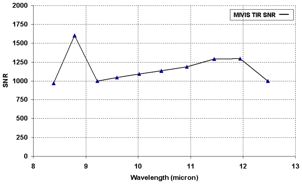 Since the sensor SNR [13] cannot be modeled without specific knowledge of the instrument characteristics, the following calculations were made using MIVIS sensor characteristics to establish its capability to retrieve spectral absorption features in the TIR region.