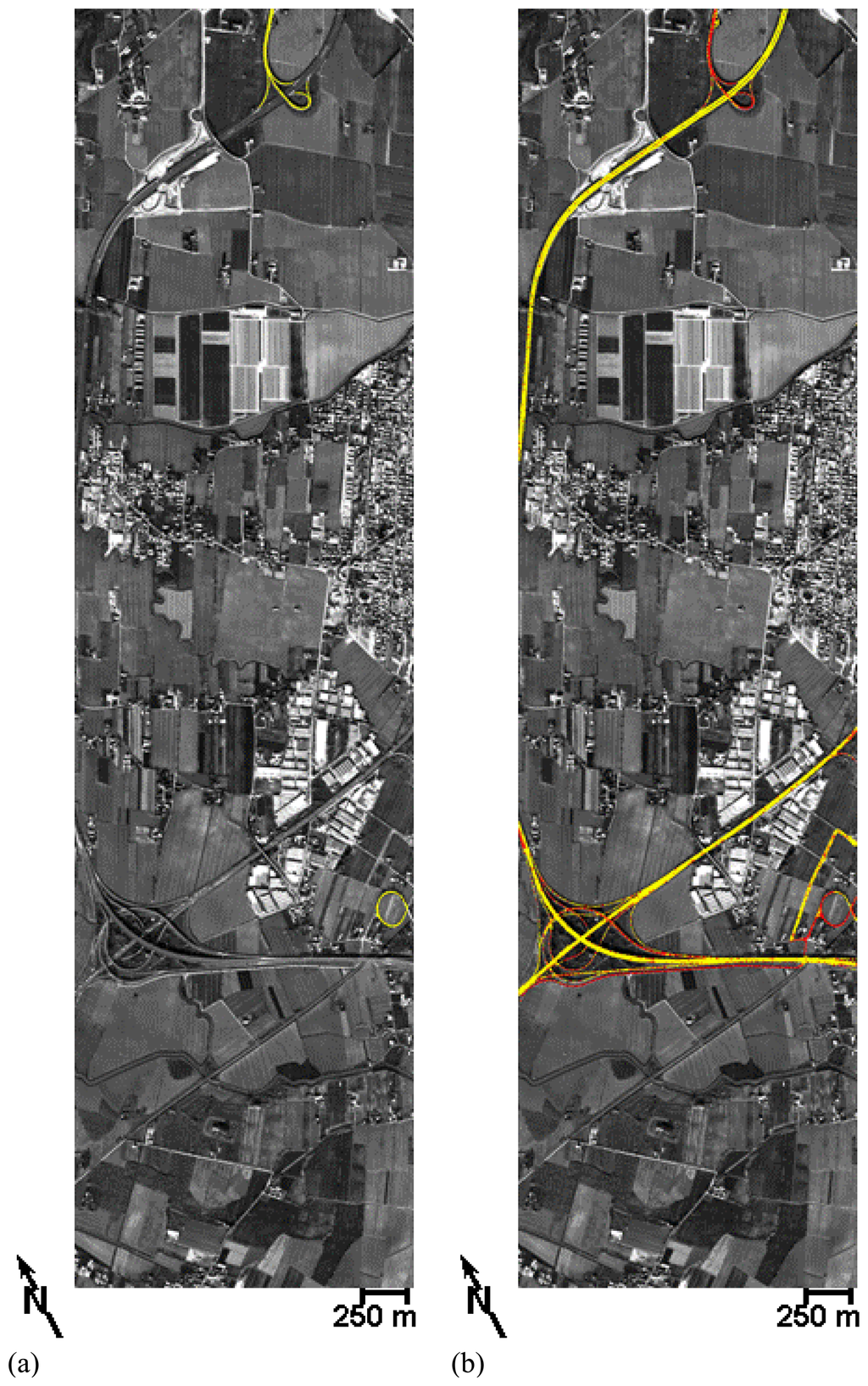 (a) In yellow are depicted the two test areas, selected for training the band-depth analysis; (b) Image showing the band-depth analysis results: in red are depicted the detected asphalt pavements showing surface defects thus to be checked for maintenance. Both images are overlaid on MIVIS channel 13 only for visualization purposes.
