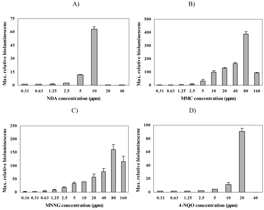 Lastly, strain BBTNrdA was exposed to 1-methyl-1-nitroso-N-methylguanidine (MNNG) and 4-nitroquinoline N-oxide (4-NQO). The results for these responses are shown in Figure 2 C and D, respectively. As with MMC and NDA, the bioluminescence of strain BBTNrdA was strongly induced by these compounds and in a dose-dependent manner. MMNG causes alkylation of the cellular proteins and DNA, leading to errors being incorporated in the DNA during replication and repair [27-28]. 4-NQO is also DNA damaging chemical which affects DNA in various ways [29] and its mechanism is similar to the damage caused by exposure to UV [8, 30]. BBTNrdA showed an increase in its bioluminescent emission.