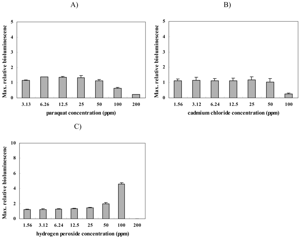 Maximum relative luminescence values seen from strain BBTNrdA after being exposed to different concentrations of (A) paraquat, (B) cadmium chloride and (C) hydrogen peroxide.