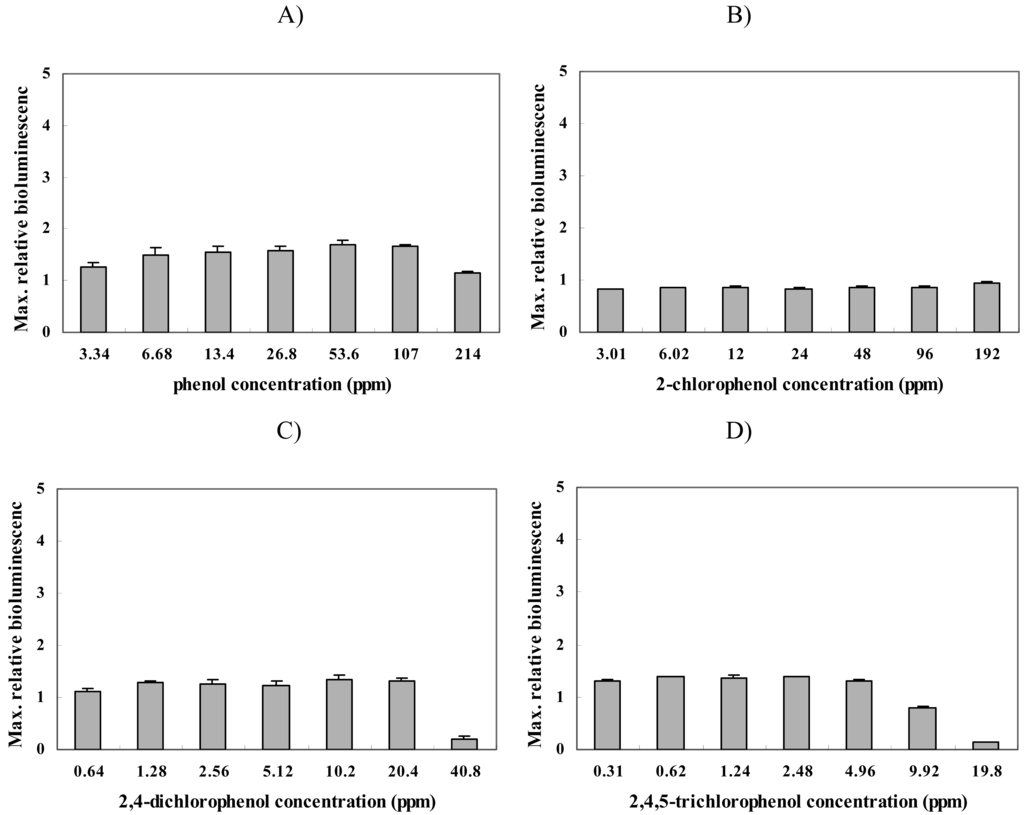 Maximum relative luminescence values seen from strain BBTNrdA after exposure to different concentration of (A) phenol, (B) 2-chlorophenol (2-CP), (C) 2,4-dichlorophenol (2,4-DCP) and (D) 2,4,5-trichlorophenol (2,4,5-TCP).