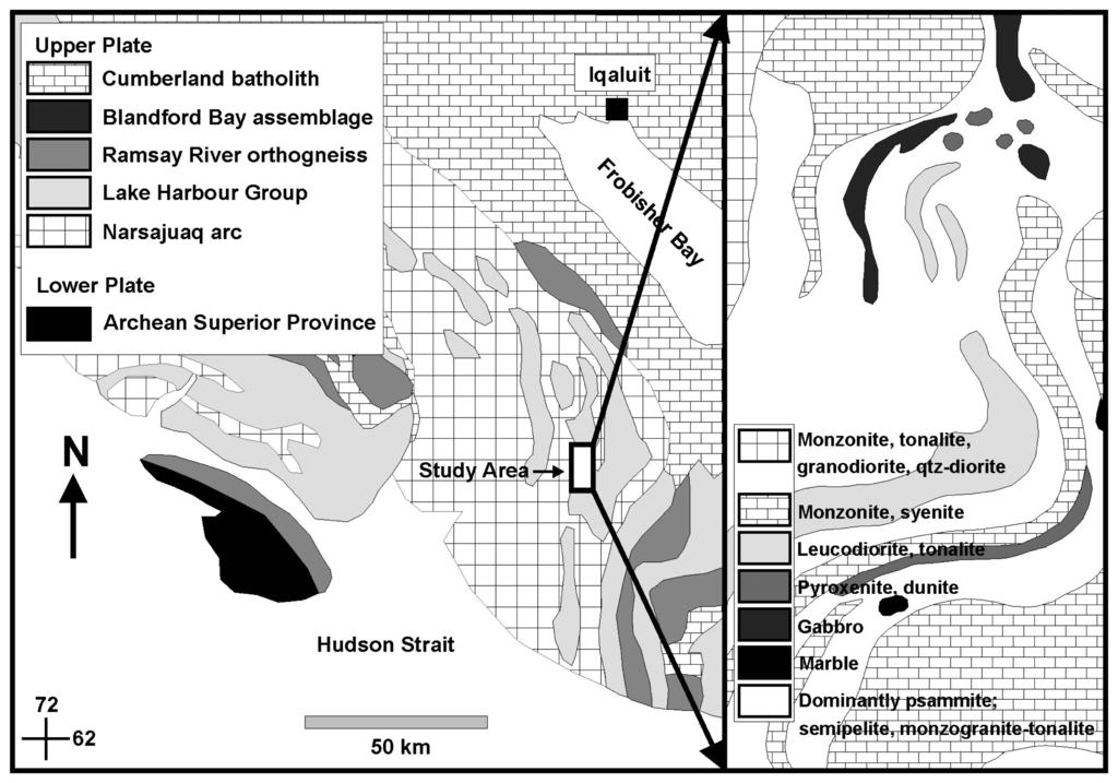 Regional geology of south-western Baffin Island and zoom of local geology of the study area (1:100 000) (modified from St-Onge et al., 1999).