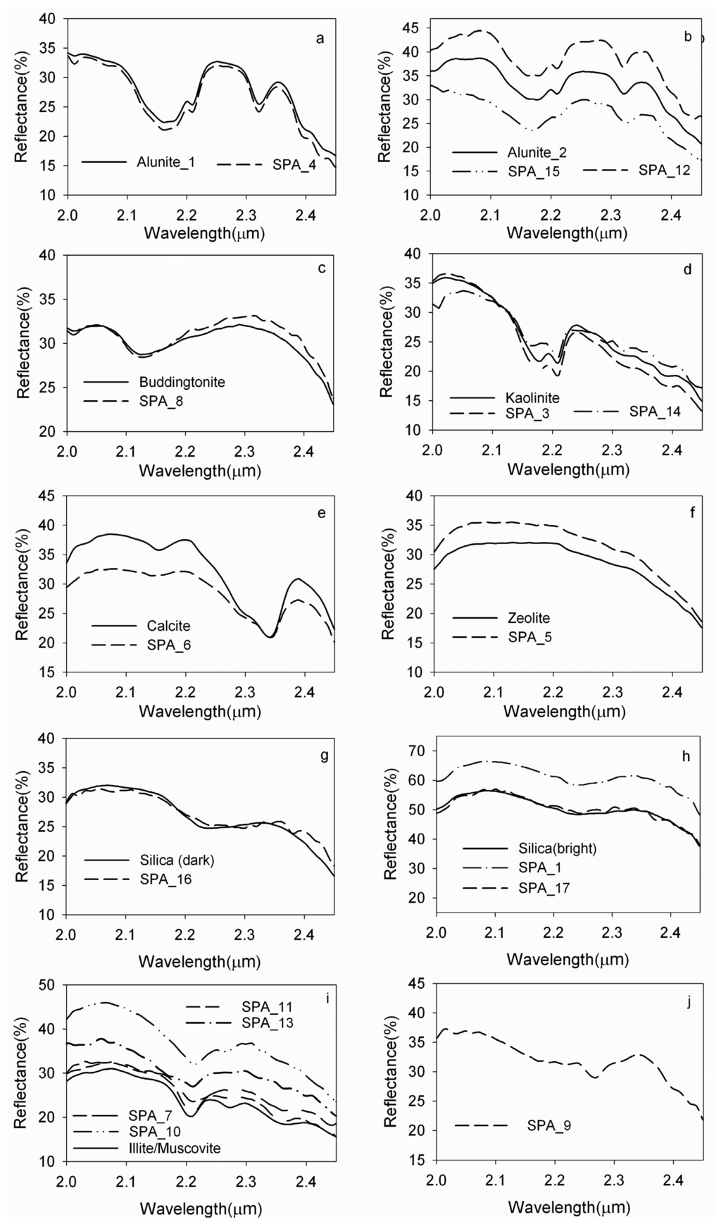 We first examine the SPA endmembers in the context of the seven mineral PPI endmembers (zeolite, alunite, buddingtonite, calcite, kaolinite, silica and muscovite/illite) previously reported by Kruse and Huntington (1996)[2]. Out of 19 endmembers derived from the SPA, 16 are for minerals and 3 for shade/shadow (Table 1). A comparison of the 16 mineral endmembers and “true”endmembers (PPI_endmembers, Section 4.1.) is shown in Figure 3. Each SPA endmember was calculated from more than 2 pixels (2-9). For each of the seven minerals we found at least one SPA endmember with a good match in spectral shape to that of the field validated PPI endmembers. When SPA picks multiple endmembers for a given mineral these differ in spectral magnitude or in subtle variations in their spectral shape (Table 1 and Figure 3). For example, two SPA endmembers (SPA_12 and SPA_15) were selected for the mineral alunite_2 (Figure 3b). SPA and PPI_endmembers result from the average of multiple candidate pixels located at vertices of the simplex. However they differ in their list of candidate pixels as PPI does not take into account spatial information, and thus, the averaging process generates different solutions resulting in endmember spectra that are distinct in their detailed shape and amplitude. One endmember, SPA_9 (with an absorption feature at 2.27 μm, Figure 3j), could not be matched to a PPI mineral endmember and has yet to be properly labeled though the observed feature is consistent with the mineral jarosite discussed in Clark et al. (2003)[43].