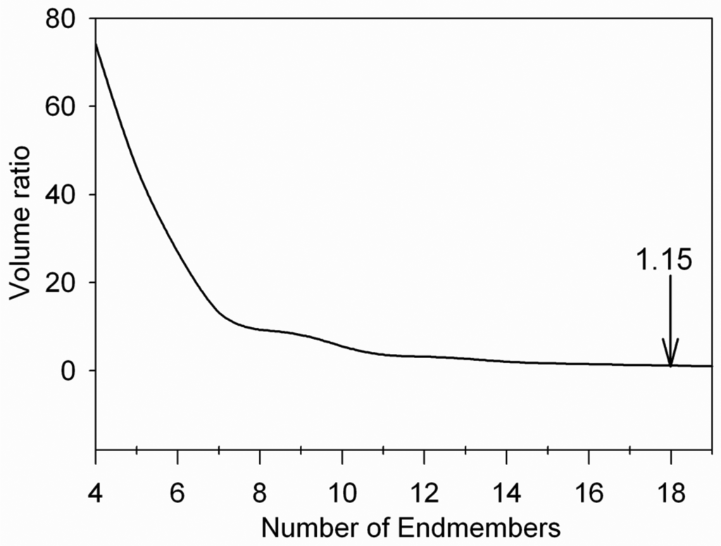 To illustrate the convergence of SPA we show the changes in the simplex volume between successive iterations (e.g. volume ratio, equation 11) as a function of the number of iterations (Figure 5). The first 6 iterations capture the most important changes in the simplex volume. With additional endmembers, the change in volume ratio decreases and converges at endmember 18 (ν _ratio18= 1.15) beyond which the volume ratio is less than 1.0. For this particular data set, the geological endmembers of interest are extracted before endmember 18 (Table 1), thus convergence of the volume ratio is in this case a good indicator of the number of useful endmembers in the scene.