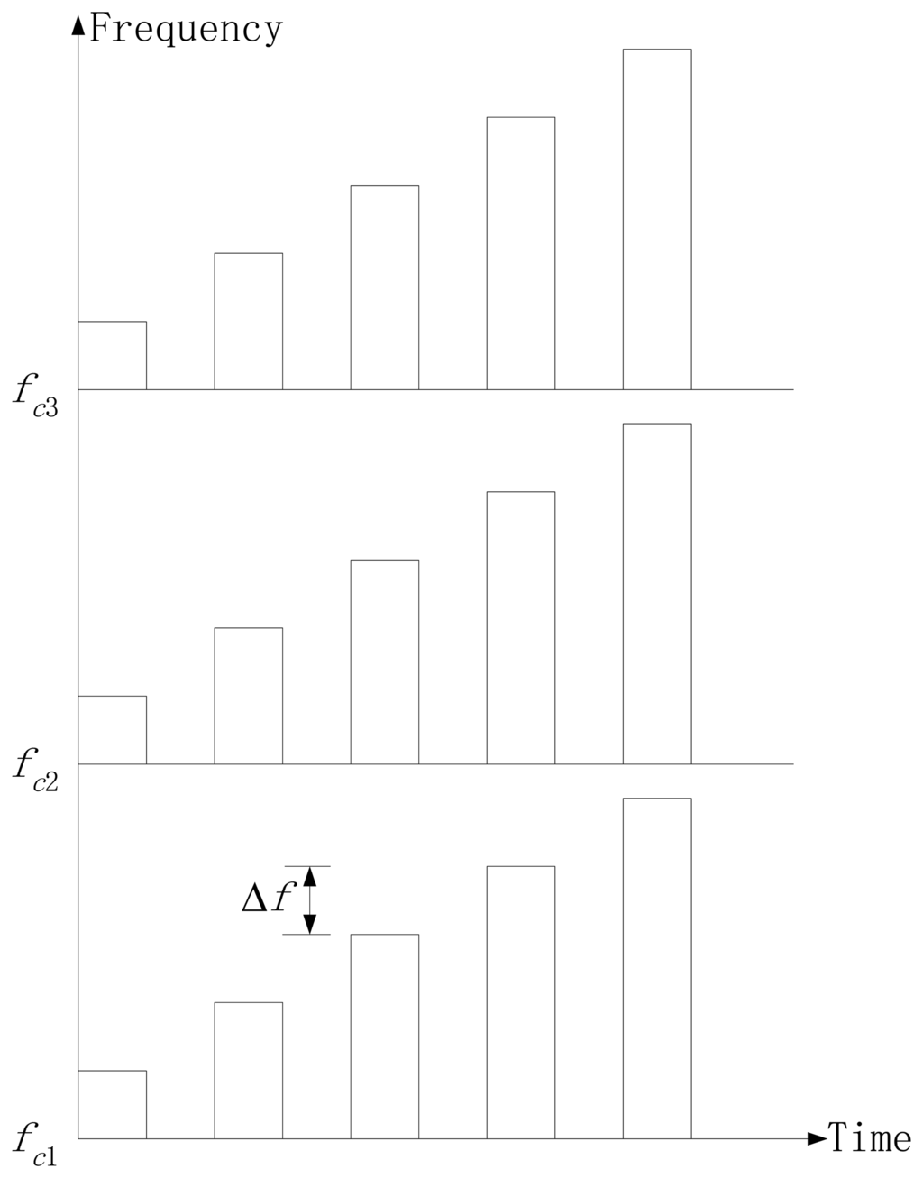 We replace the single stepped-frequency pulse train by multiple stepped-frequency pulse trains. This new waveform is shown in Figure 1, where three (or multiple) stepped-frequency pulse trains with different base carrier frequencies are simultaneously used. This can be realized by the following way: three antennas are fixed in the radar platform, and the same stepped-frequency pulse train is modulated on different carrier frequencies fc1, fc2 and fc3 and transmitted by three antennas, respectively, and then the different echoes onfc1, fc2 and fc3 are collected and demodulated by three antennas, respectively. Without loss of generality, we assume fc1 < fc2 < fc3 and (fc2 − fc1) and (fc3 − fc1) are two distinct positive real numbers and not integer multiple of each other.