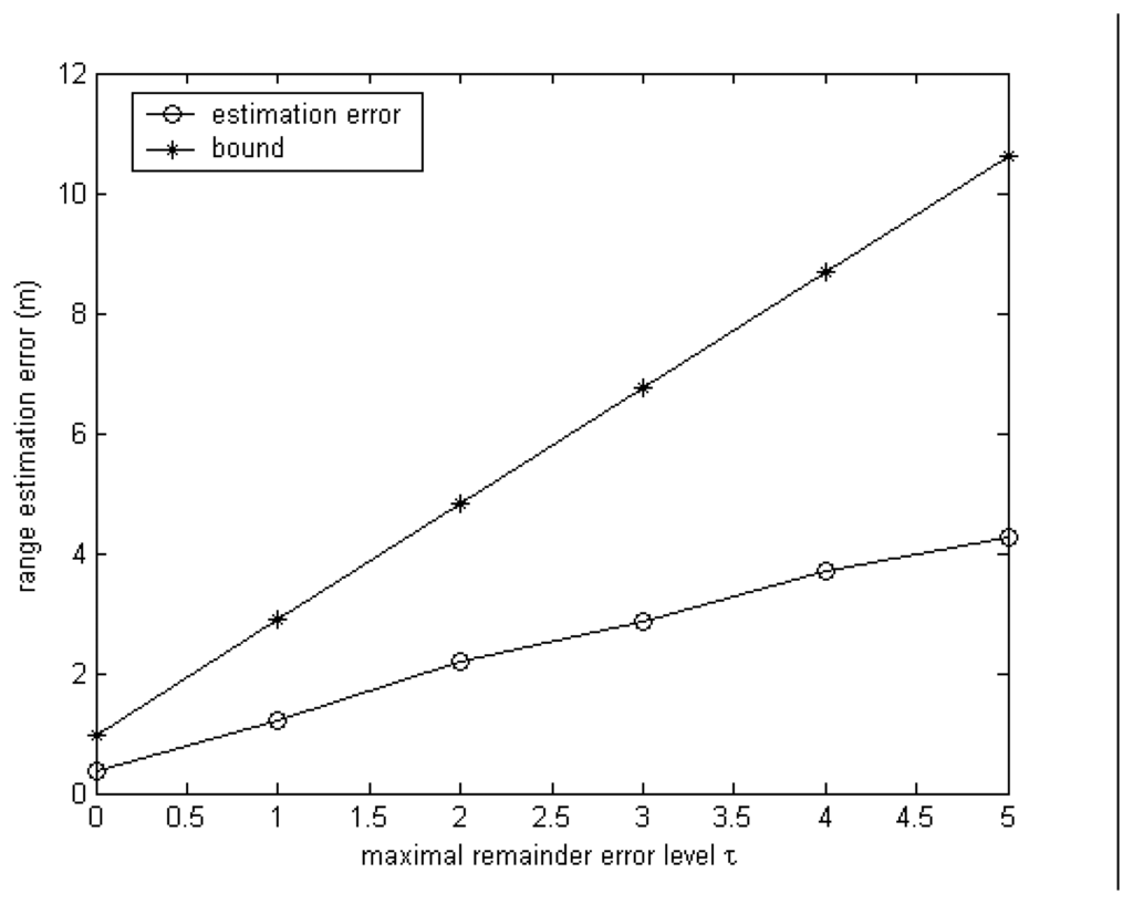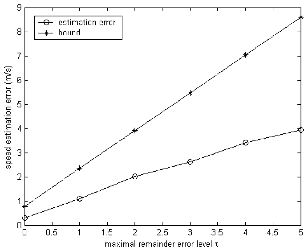 According to the derivation in the previous section, one can calculate that Γ = 6x109, Γ1 =3 and Γ2 =2. The maximal determinable speed is | vmax | =120m/s according to (10). We consider the maximal remainder error levels τ =0, 1, 2, 3, 4, 5 and let P=128 that satisfies (11). In Fig. 2, the error between the estimate vˆ in (13) and the true value of v and the error upper bound in (14) versus various τ are plotted, and they are marked by « and *, respectively. In Fig. 3, the error between the estimate rˆ in (15) and the true value of r and the error upper bound in (16) versus various τ are plotted, and they are marked by « and *, respectively. In Fig. 2 and Fig. 3, τ =0 means high SCNR (signal-to-clutter-noise ratio) case while the larger τ means low SCNR case, and the results are obtained by 100 trials. One can see the proposed algorithm robustly provides small estimation errors, even when the remainders are erroneous.