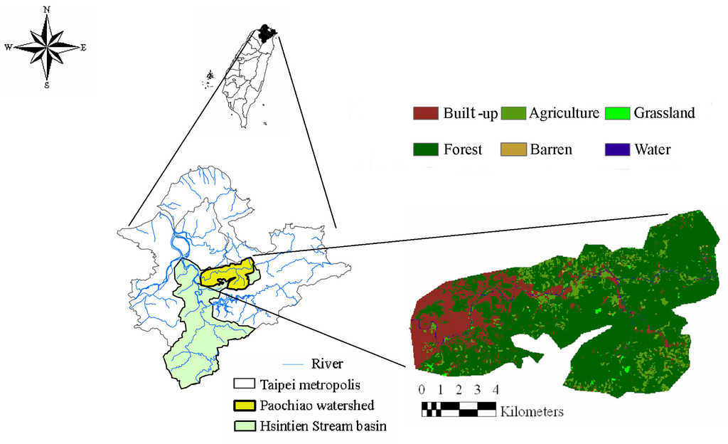 The Paochiao watershed is an urbanized watershed in the Tamsui River Basin. The watershed is bordered to the south by the Taipei metropolitan area (Figure 1). The Paochiao watershed is approximately 98.61 km2 with a mean elevation of 214.82m. Due to the expansion of the Taipei metropolitan area, land use and its patterns in the Paochiao watershed have changed over the last decade. Under an increasing population, the watershed has become a high-density urbanized watershed, especially in the downstream watershed area. Total population in 2000 was 237,861. The land uses in 2000 were 74.78%, 15.26%, 8.24%, 0.83%, 0.65 %, and 0.24% for forest, built-up land, cultivated land, grassland, water, and bare land, respectively.
