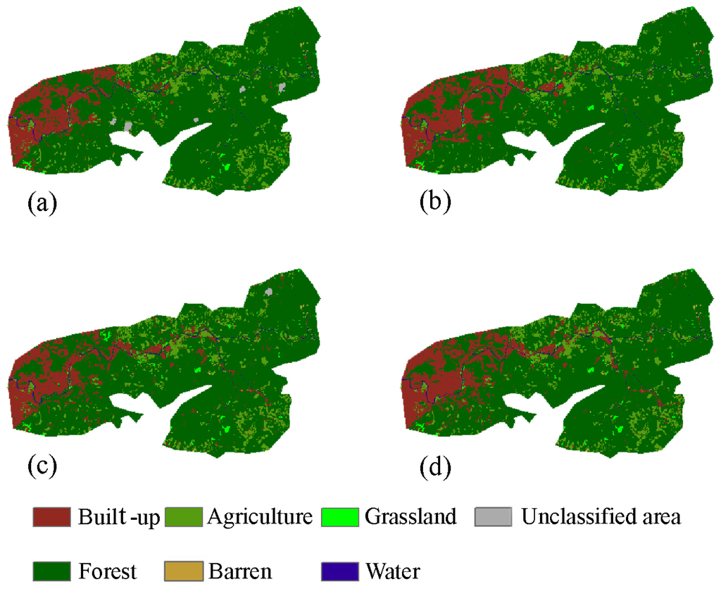 Land-uses of the Paochiao watershed in (a) 1990; (b) 1993; (c) 1998; (d) 2000.