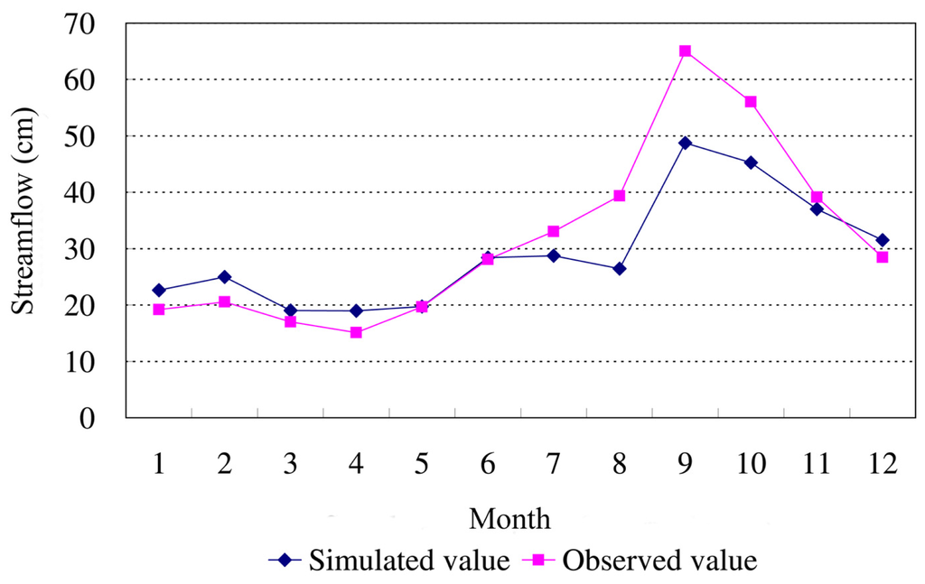 Historical and future land-use patterns were fed into the GWLF model to simulate hydrological components of the Paochiao watershed. Stream flow data was used for 1990–2003 to verify the simulated stream-flow modeled using the GWLF model (Figure 3). Additionally, the R2 value of the linear regression model of the monthly mean stream of simulated and observed data was 0.90, and the difference between simulated and observed data was significant at p ≤ 0.01.
