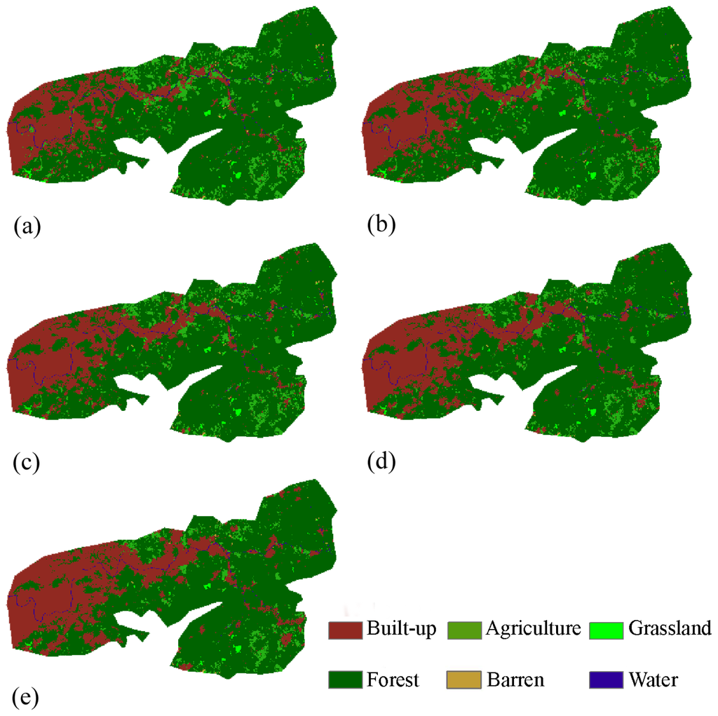 SLEUTH simulated land use spatial distribution in Paochiao watershed (a)2005 (b)2010 (c)2015 (d)2020 and (e)2025 year.
