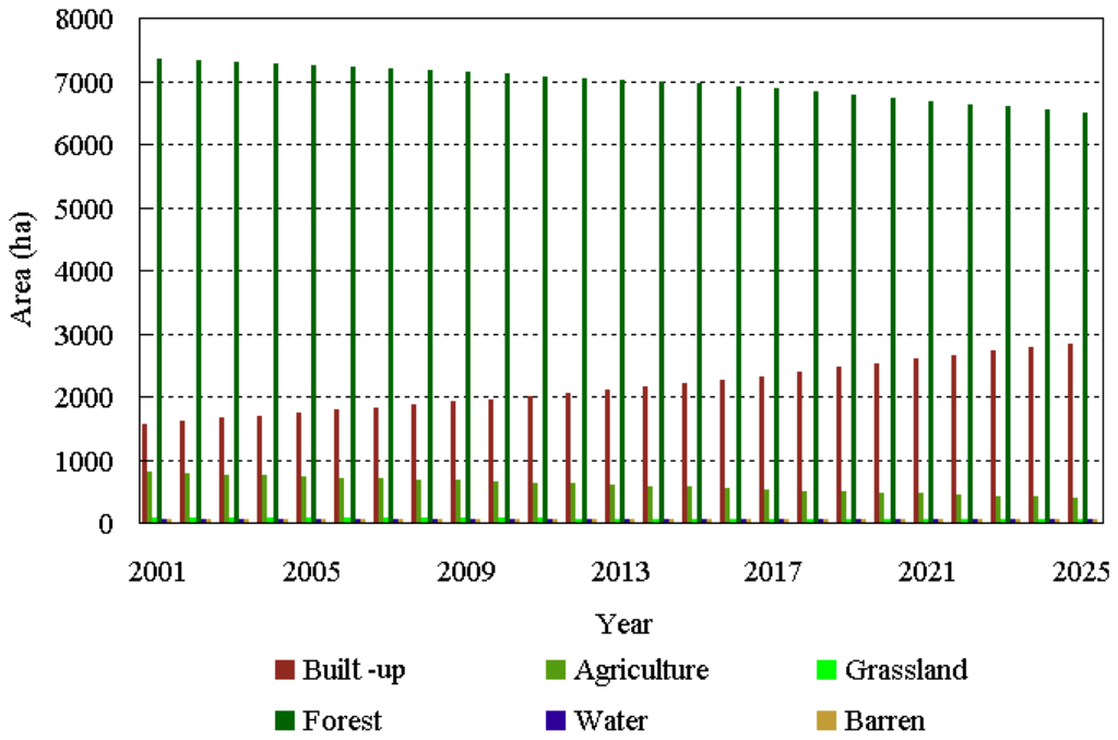 Statistical matrices of goodness-of-fit (Table 1), for SLEUTH modeling in this study were 0.94, 0.64, 0.93, 0.92, 0.71, and 0.91 for metrics of Compare, Population, Edges, Clusters, Lee-Sallee, and F-Match, respectively. The slightly low value for the Population parameter is due to the simulated numbers of urbanized grid cells in each year from 1990–2000 deviating from the observed numbers. This phenomenon indicates that the SLUETH model, which simulates urban sprawl based on regulating the state of grid cells in the vicinity of land-uses. The spread of urbanized grid cells may be scattered rather than diffusing from current urbanized centers. Simulation results predicted by SLEUTH modeling from 2001–2005 (Figure 4) indicate that the built-up land is the only land-use class that has a monotonic increase in its area from 1551.68 ha in 2001 to 2833.12 ha in 2025. Simulated land-use maps show that the most developed and frequently changed areas are located in the eastern part of (downstream area) and along the stream in the Paochiao watershed, especially in low elevation areas (Figure 4). The increase ratio for built-up area is 82.58%. Other areas of land-use classes all decreased with ratios of 49.31%, 47.92%, 42.40%, and 11.50% for cultivated land, bare land, grassland, and forest, respectively; the water body remained unchanged (Figure 5).