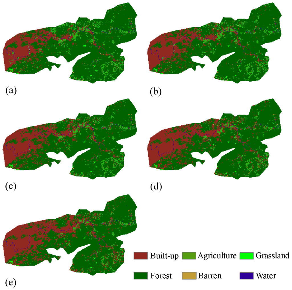 - Dietzel, C.; Clarke, K.C. The effect of disaggregating land use categories in cellular automata during model calibration and forecasting. Computers, Environment and Urban Systems 2006, 30(1), 78–101. [Google Scholar]