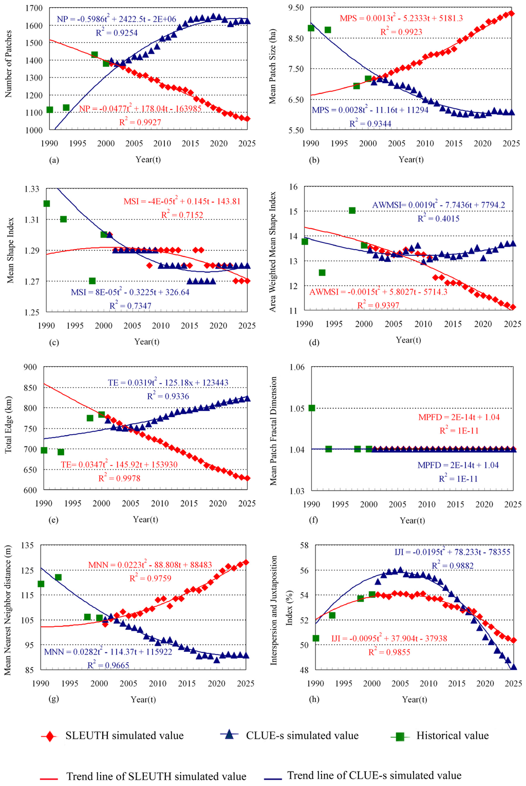 The fitting results of the predicted landscape matrices of (a)NP, (b)MPS, (c)MSI, (d)AWMSI, (e)TE, (f)MPFD, (g)MNN, and (h)IJI using the CLUE-s and the SLEUTH models, and the comparison between the extrapolating results and the historical landscape matrices.