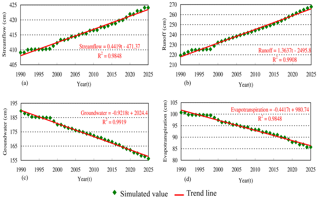 The monthly changes in (a) streamflows, (b) surface runoffs, (c) groundwater discharges, and (d) evapotranspiration due to land-use changes in the watershed 3.4. Discussions.