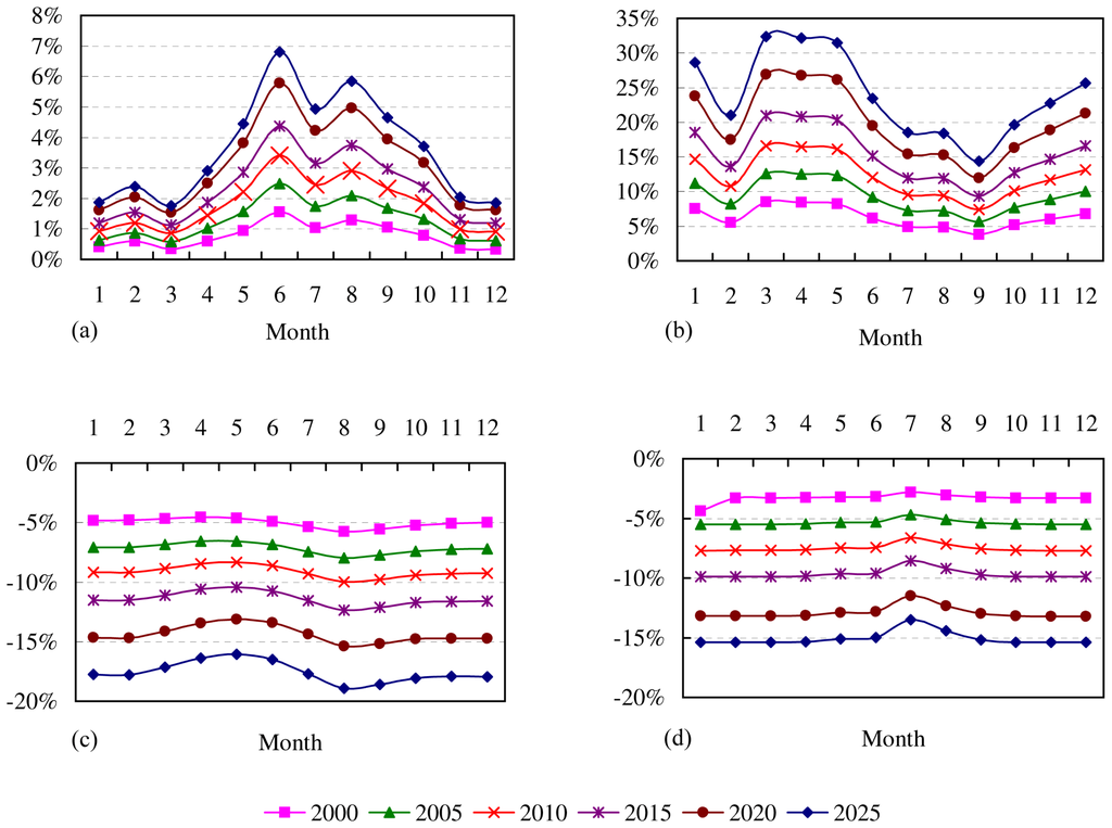 Figure 9 presents the differences in monthly streamflow, surface runoff, groundwater discharge and evapotranspiration between 1990 and land-use changes in 2005, 2010, 2015, 2020 and 2025. The highest changes in monthly streamflows occurred during May–August 2012, 2016, 2020, and particularly in 2025 when monthly streamflow increased by 7.0% (Figure 9(a)). The peak differences in monthly streamflow between land-use change and no change occurred in June and August of all study years. Peak differences in surface runoff between land use change and no change occurred in March, April and May of each year; in 2025 peak differences were highest (32.0%) (Figure 9(b)). Figure 9(c) shows the differences in monthly groundwater discharge between land-use changes and no change (1990). The greatest decrease (−18.0%) in groundwater discharge occurred in August 2025 (Figure 9(c)). The decrease (−15.0%) in evapotranspiration occurred in all months during 2025, except for June (Figure 9(d)).