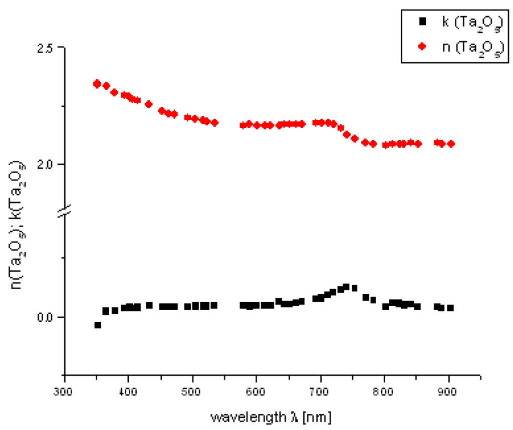For ellipsometric analysis (EP3, Nanofilm Technologie GmbH, Göttingen, Germany) we used Ta2O5 films on a glass substrate manufactured by Oerlikon (former Unaxis Optics), Liechtenstein. The refractive index of the Ta2O5 films was n = 2.1 ± 0.02 at λ = 633 nm. We characterized those layers at a laser-wavelength of λ = 532 nm, a refractive index n = 2.1 and an extinction coefficient k = 0.02 and determined the thickness of Ta2O5 with 161.4 nm ± 0.1 nm and a mean square error (MSE) of 0.89. The layer thickness was specified with 160 nm by Oerlikon. Figure 1 shows the determined refractive indices and extinction coefficients via spectroscopic ellipsometry at an angle of incidence of 50°.