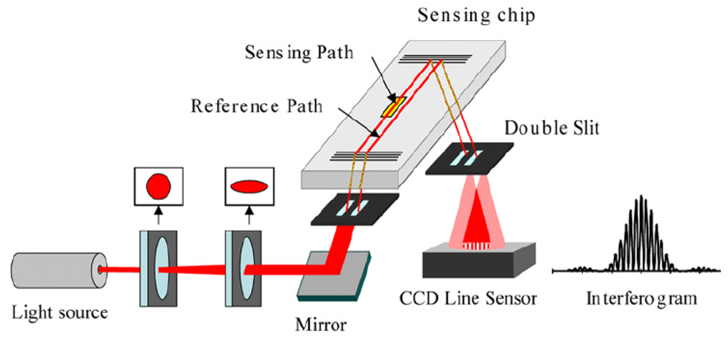 Lukosz et al. [] compared the theoretical sensitivities of integrated-optical sensor systems including surface plasmon resonance and interferometric sensors and predicted interferometer-based techniques to have the highest sensitivity. Distinctive features of Young interferometers are space-resolved signals, i.e. the interference pattern known from a double slit where the phase shift can be evaluated with high precision, and their ability to reference external influences with a reference path. Figure 10 shows schematically the Young interferometer from []. Light passes through several optical components before being split in two beams by a double slit and coupled into the waveguide via a grating. The two beams travel through the waveguide forming the sensing and reference path. The analyte solutions are passed over the surface with a two-channel flow cell covering measurement and reference channel separately. If the surface mass coverage changes, e.g. due to analyte binding, the phase velocity of the guided light and thereby the effective refractive index is changed. From the interference pattern the corresponding phase shift is now determined according to